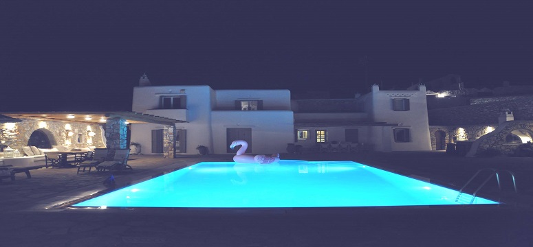 Villa Canal is ocated at the southwestern part of Mykonos in Kanalia area, very close to the sea. It is a spacious property ideal for groups as well as for families with kids. It provides full cozy accommodation, as it has one master bedroom with bathroom and 5 extra rooms with air conditioning, heating and bathrooms. The dinining room has fireplace, air conditioning and heating radiators and the kitchen is furnished and equipped. The exterior area provides large swimming pool, exterior shower with WC, as well as Pool Bar and BBQ with stools for extra recreational activities during vacation.
